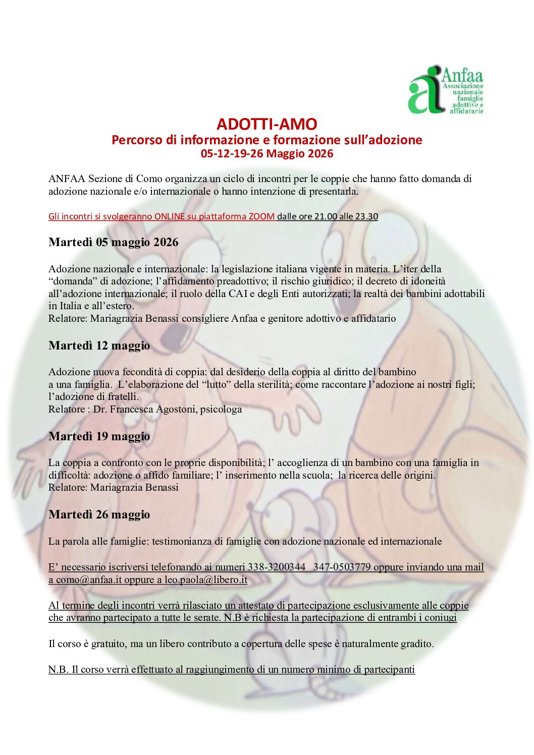 La sezione di Como dell’Anfaa offre assistenza a coppie e singoli che si interessano di problemi di minori o che vogliano avere informazioni riguardo l’affidamento e l’adozione.