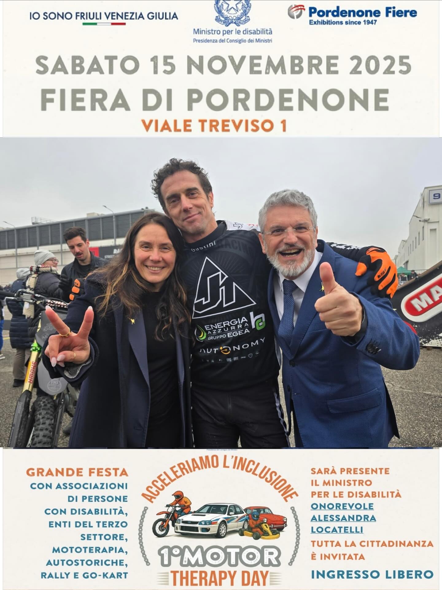 Alla Fiera di Pordenone si è tenuto un evento speciale pensato per offrire alle persone con disabilità e alle loro famiglie un’occasione unica di divertimento, emozione e condivisione. A bordo di moto da cross, auto, auto da rally e go-kart biposto è stato possibile vivere un’esperienza adrenalinica e accessibile a tutti.